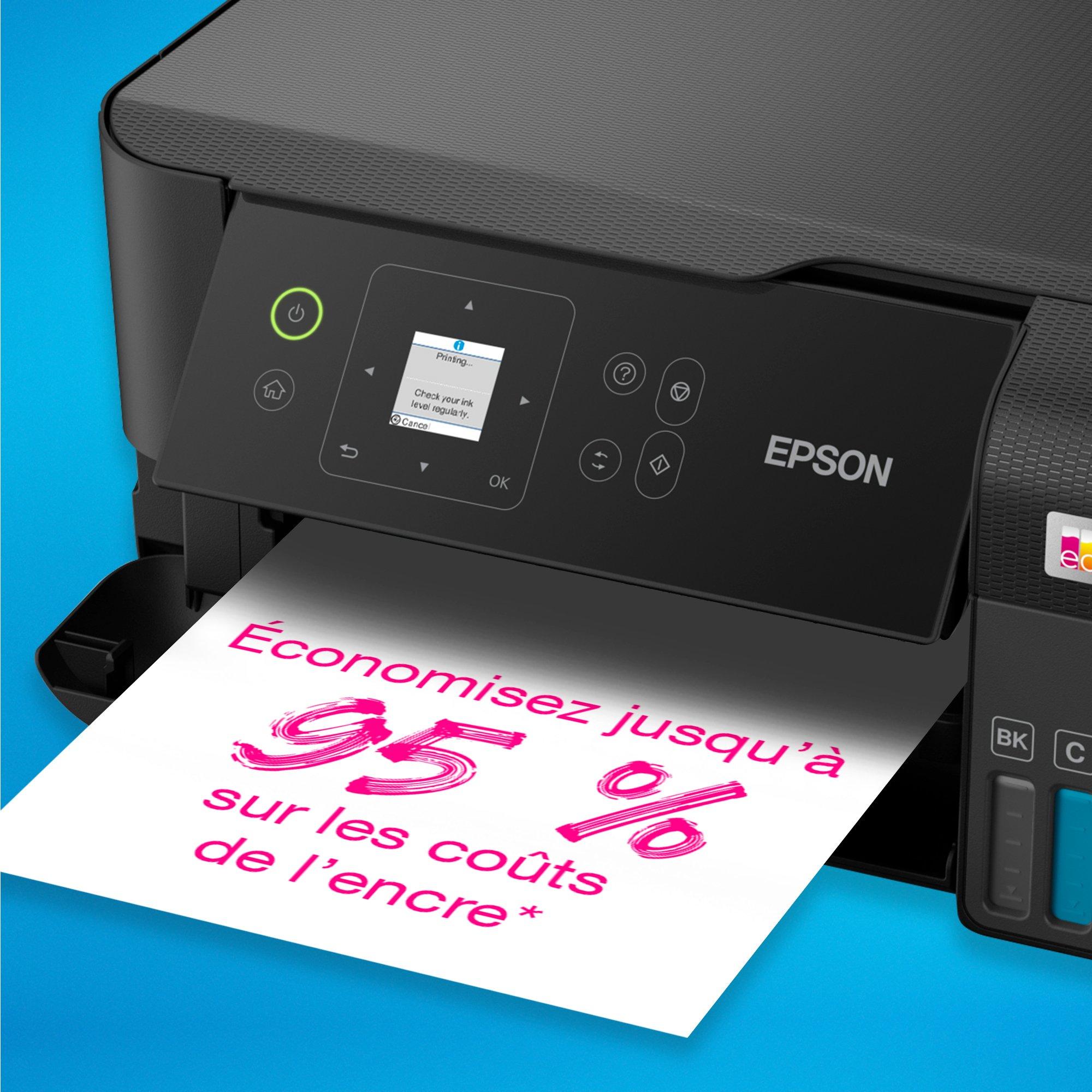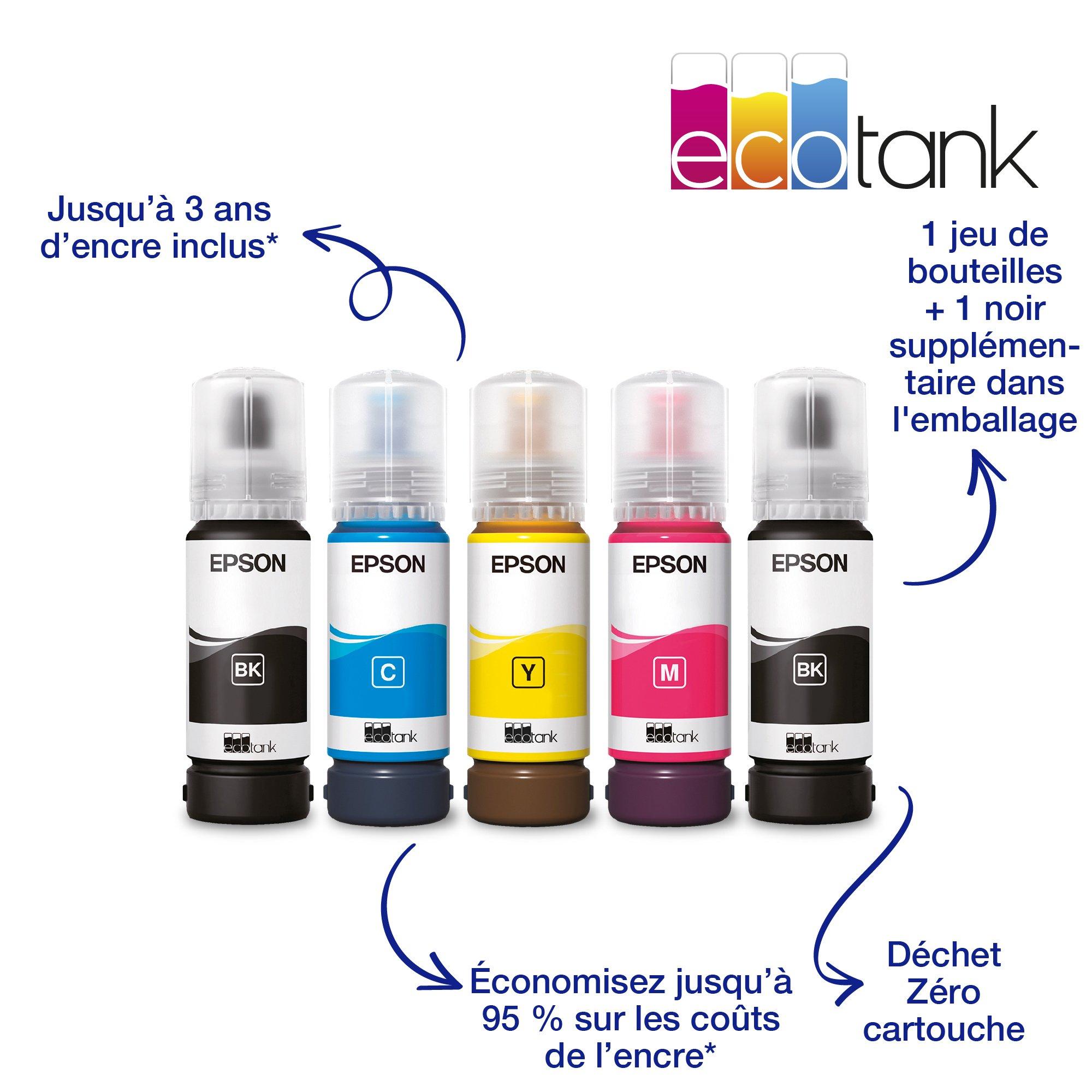 Cette imprimante multifonction vous permet d’économiser jusqu’à 90 % sur vos coûts d’impression* et elle est livrée avec jusqu’à 3 ans d’encre*. Un jeu de bouteilles d’encre permet d’imprimer jusqu’à 4 500 pages en monochrome et 7 500 pages en couleur*.